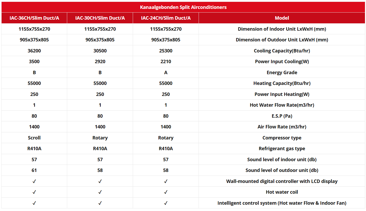 - Kanaalgebonden Split 24000: Perfect voor woonruimtes van 50 tot 70 m², biedt efficiënte koeling en constant comfort.